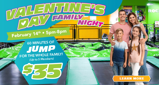 Save time and book now! Redeem from 5pm to 7pm on 2/14/20. Last jump time to redeem is at 7pm for 1 hour of jump time to 8pm as park begins Neon Jump Night at 8pm. Savings based on regular in park price of $17 for one hour of jump time per person. Minimum 3 jumpers and maximum of 5 jumpers per offer. Cannot be combined with other offers.