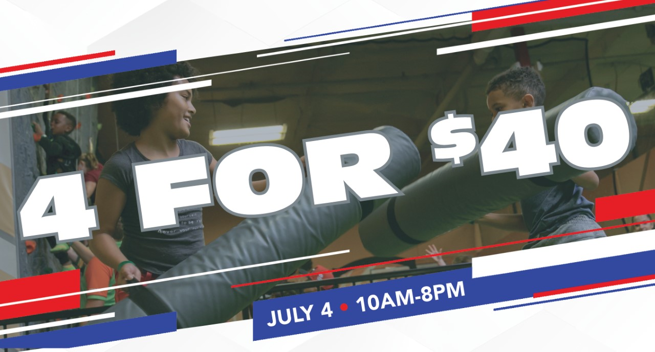 For contactless payment and to save time, book now! Redeem on 7/4/20 during Open Jump. Savings of $28 based on regular in park price of $17 for one hour of jump time per person, during Open Jump. Cannot be combined with other offers. Park closes at 8pm due to area fireworks shows.