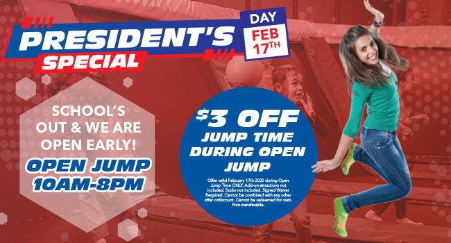 Receive $3.00 off your jumptime purchase on President's Day, Monday-February 17th 2020!