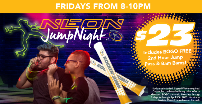 Applicable to ROCKIN' FRIDAY NIGHT FROM 8PM TO 10PM Includes BOGO 2nd Hour FREE Jump Pass & Bam Bams for one LOW price!