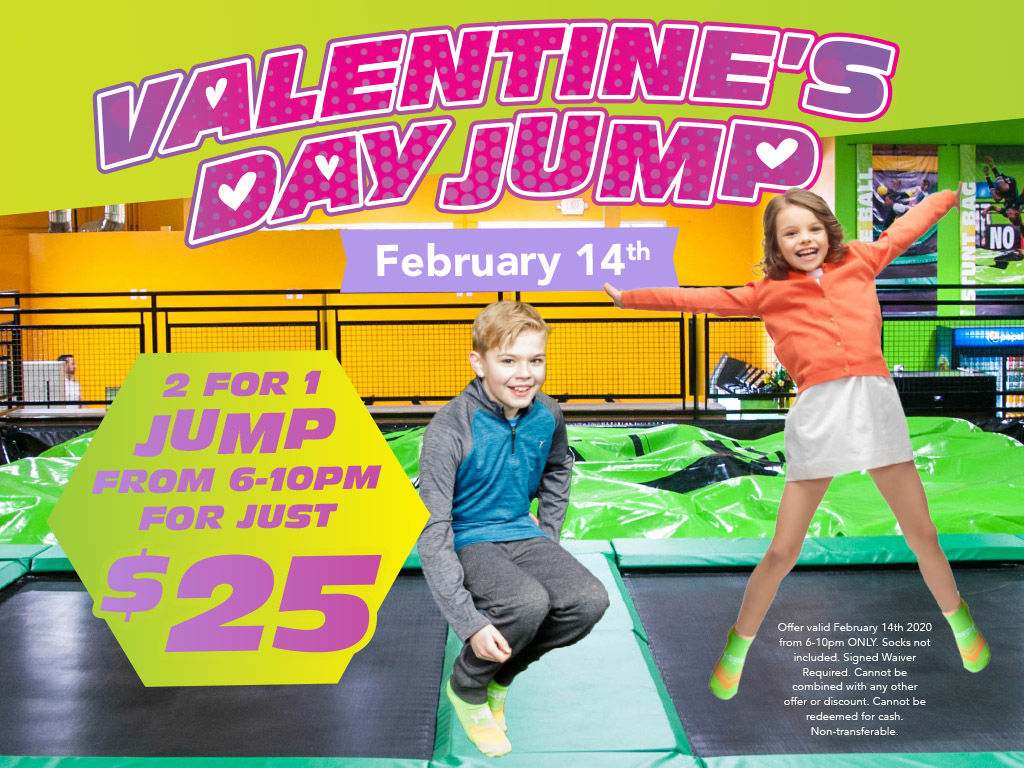 From 6 to 10pm on Friday, February 14th 2020 2 people can jump for just one low price of $25!